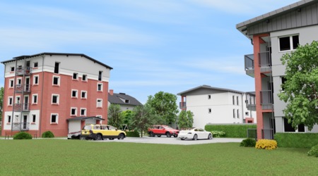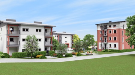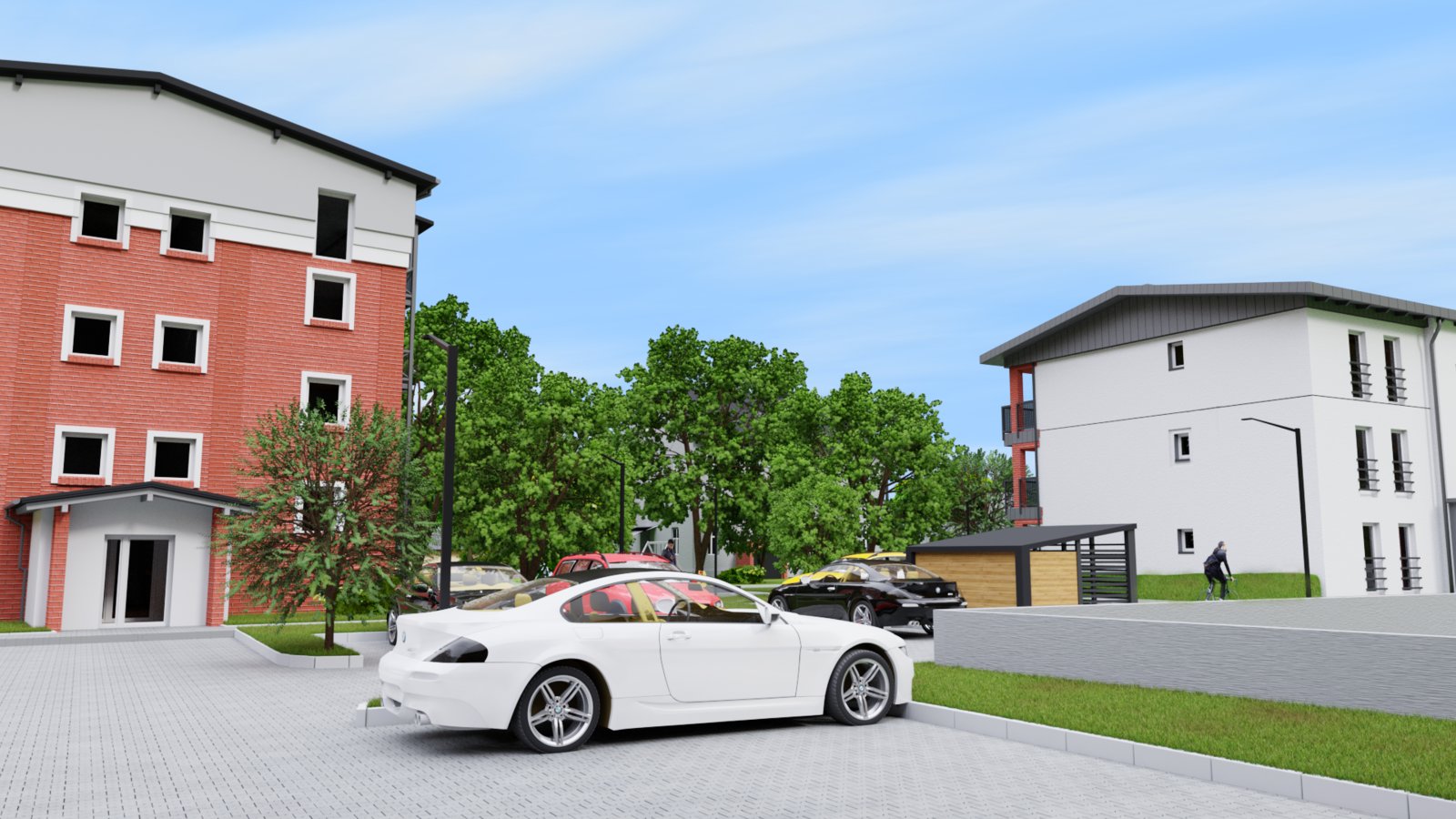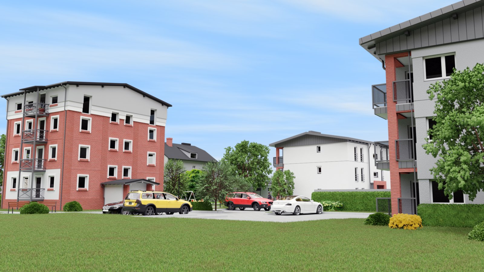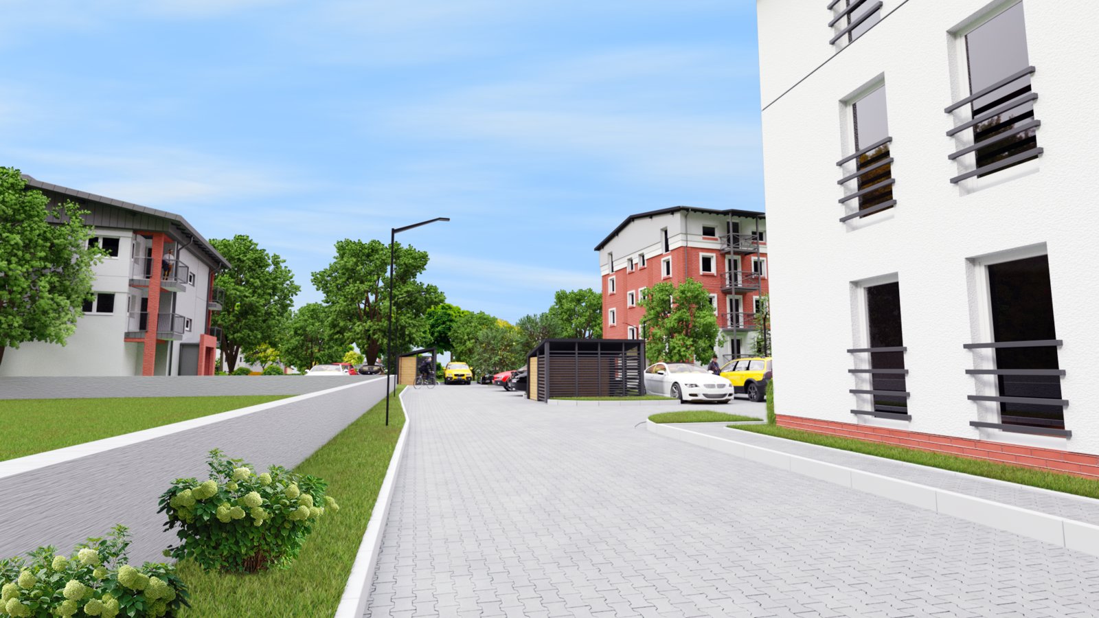 Zespół mieszkaniowy zostanie wyposażony w drogi, parkingi, place gospodarcze, plac zabaw dzieci mniejszych, place rekreacyjne, oraz zieleń.
